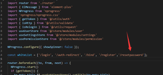 8.配置白名单:在src/permission.js文件中 白名单whiteList数组里将此找回密码页面添加进来,否则会出现需要登录才可访问该页面