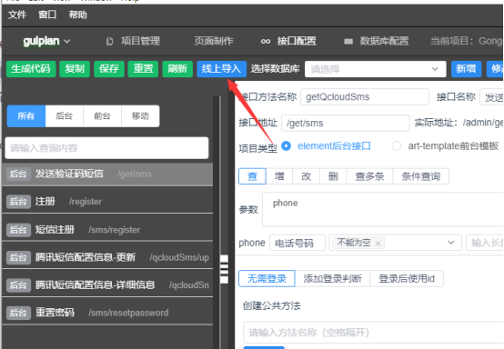 在页面编辑,接口配置,数据库配置中有个线上导入按钮