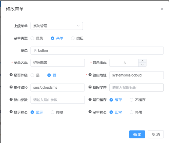 4.配置动态路由:短信配置后台页面导入之后菜单管理根据文件与文件名称配置预览地址。