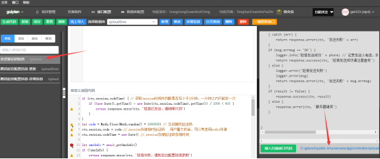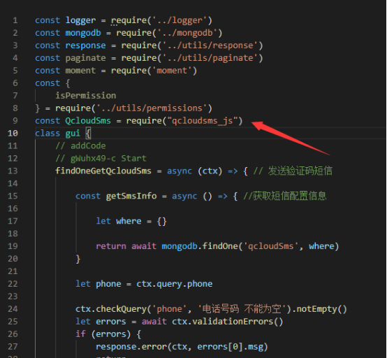 3.引用插件:在发送短信接口中,双击接口文件即可开接口源代码,输入插件引用插件代码 const QcloudSms = require("qcloudsms_js")